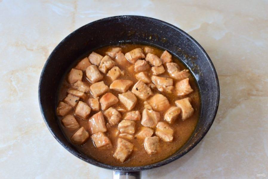 Получившимся соусом залейте мясо и, помешивая, доведите все до кипения. За счет крахмала соус станет приятной густоты. Попробуйте на вкус. При необходимости добавьте соль. Соевый соус уже содержит соль.