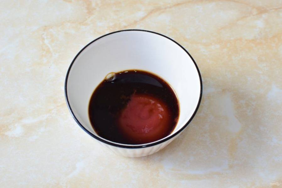 Для соуса соедините соевый соус и кетчуп.