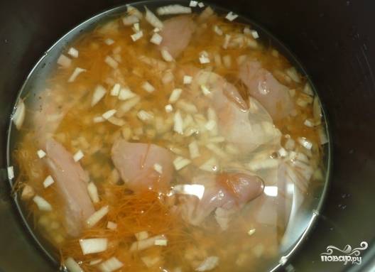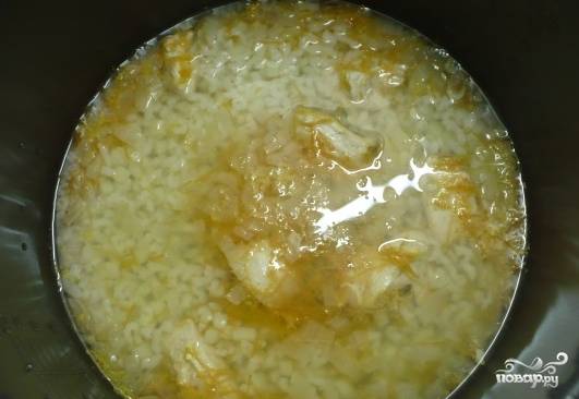 Рис промойте под водой. Далее все составные опустите в чашу мультиварки и налейте приблизительно 800 мл фильтрованной воды. Готовьте в режиме «Тушение» в течение часа.