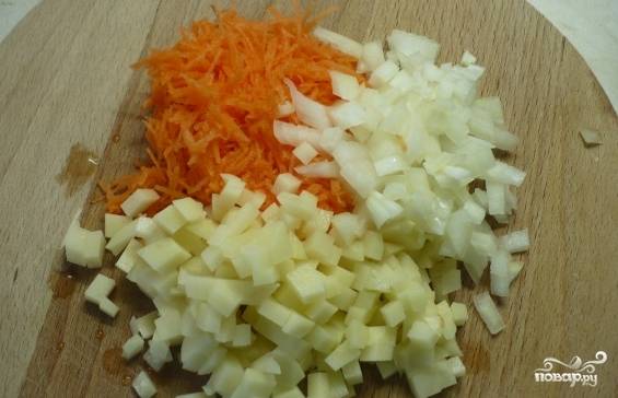 Вымытые и очищенные овощи измельчите. Лук и картофель нарезаем кубиками, а морковь трем на обычной терке.