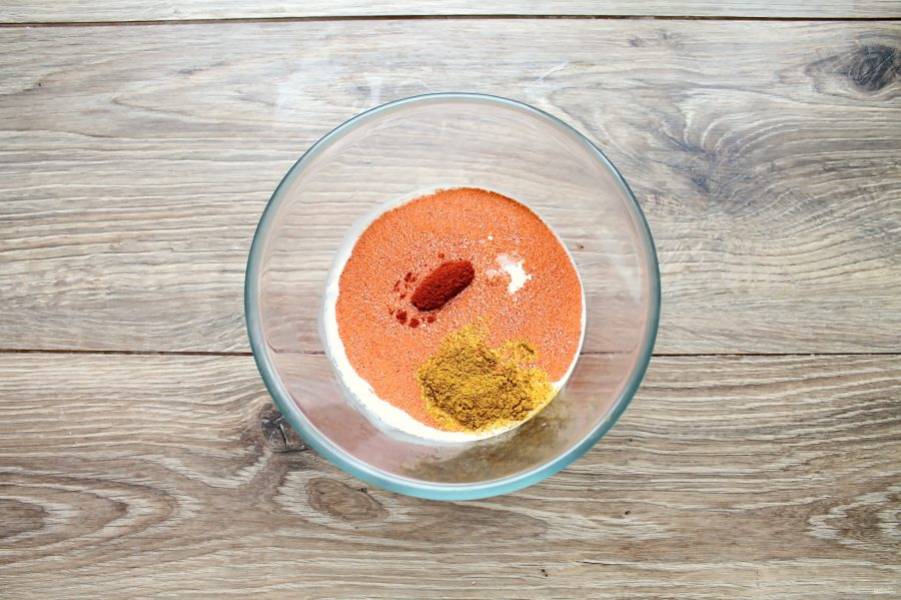 В миску налейте сливки, добавьте соль, карри и паприку, перемешайте.