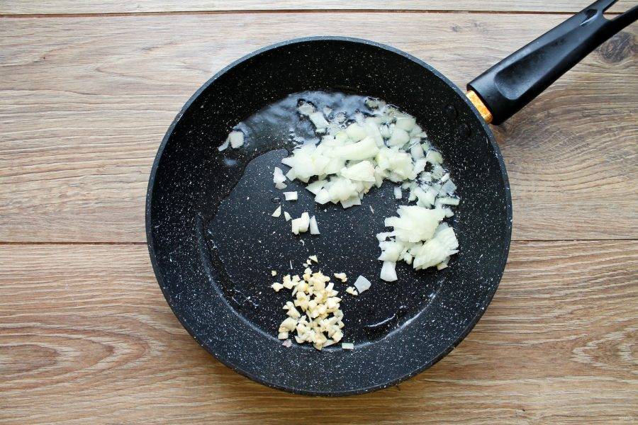 В сковороду налейте растительное масло и разогрейте на среднем огне. Выложите мелко нарезанный репчатый лук и чеснок. Обжаривайте все в течение одной минуты, перемешивая.