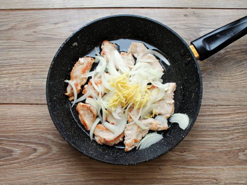 Имбирь очистите и порежьте тонкой соломкой, выложите в сковороду. Обжаривайте все в течение одной минуты.