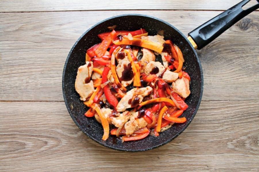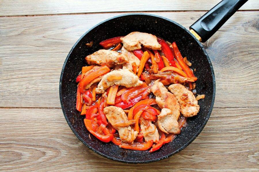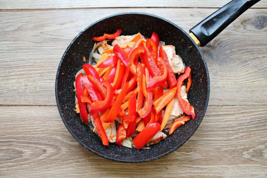 Болгарский перец вымойте, обсушите, удалите плодоножку и семена. Порежьте его средней соломкой. Добавьте его в сковороду к индейке с овощами. Обжаривайте все в течение 3-5 минут, перемешав.