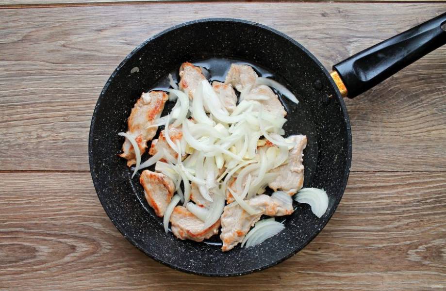 Чеснок очистите и порежьте кружочками, добавьте в сковороду.