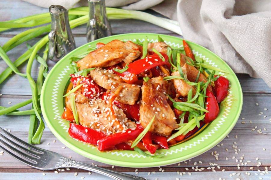 Снимите с огня, разложите по тарелкам, посыпьте кунжутом и порезанным зеленым луком.