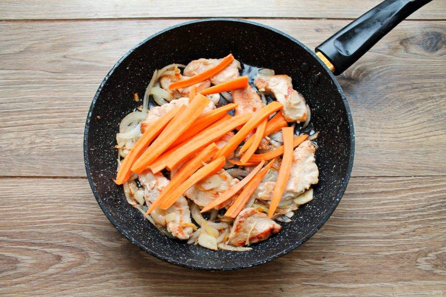Морковь очистите, сполосните и порежьте соломкой. Добавьте в сковороду и обжаривайте в течение 3-5 минут, перемешав.
