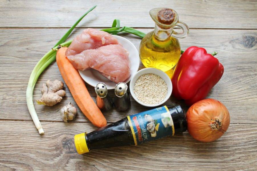 Подготовьте все необходимые ингредиенты для приготовления индейки в устричном соусе.