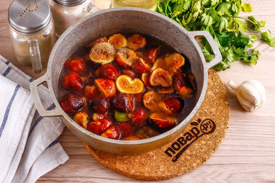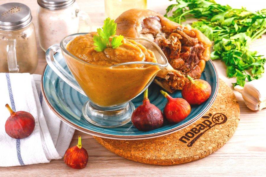 Густой соус из инжира можно подать к запеченному либо отварному мясу, курице, кролику, индейке и т.д., исключая рыбу. Блюдо понравится по вкусу тем, кто любит сочетать сладко-пряные соусы с мясом.