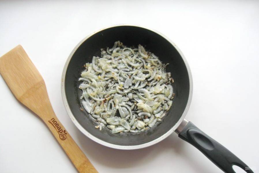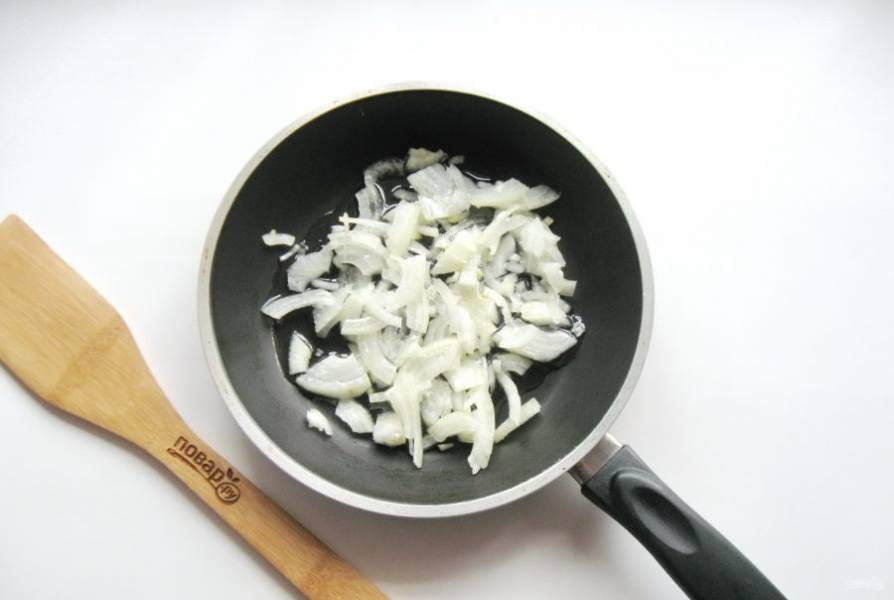 Репчатый лук очистите, помойте и нарежьте. Выложите в сковороду.