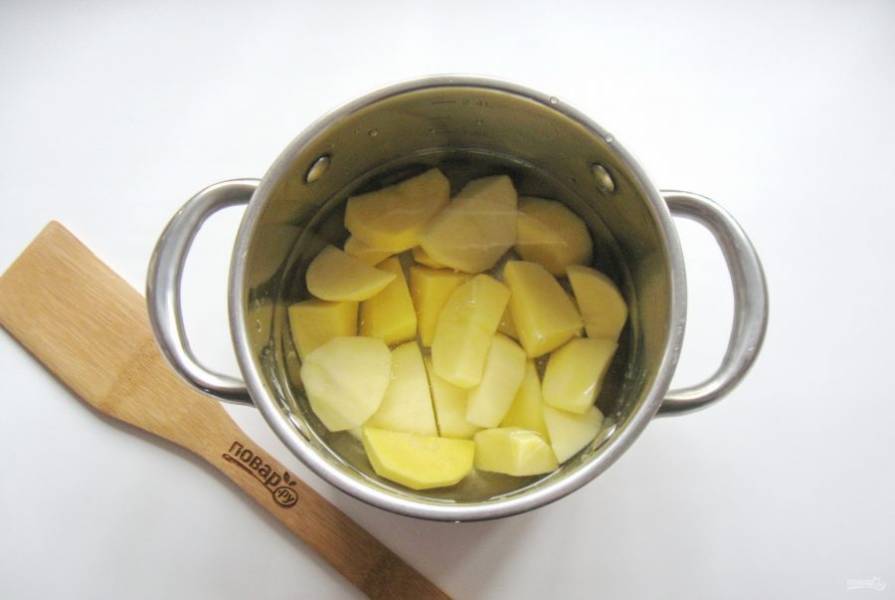 Картофель очистите, помойте и нарежьте. Выложите в кастрюлю и залейте водой. Посолите по вкусу. Варите картофель до готовности. После воду слейте.