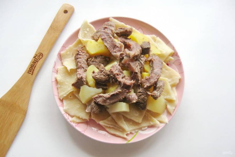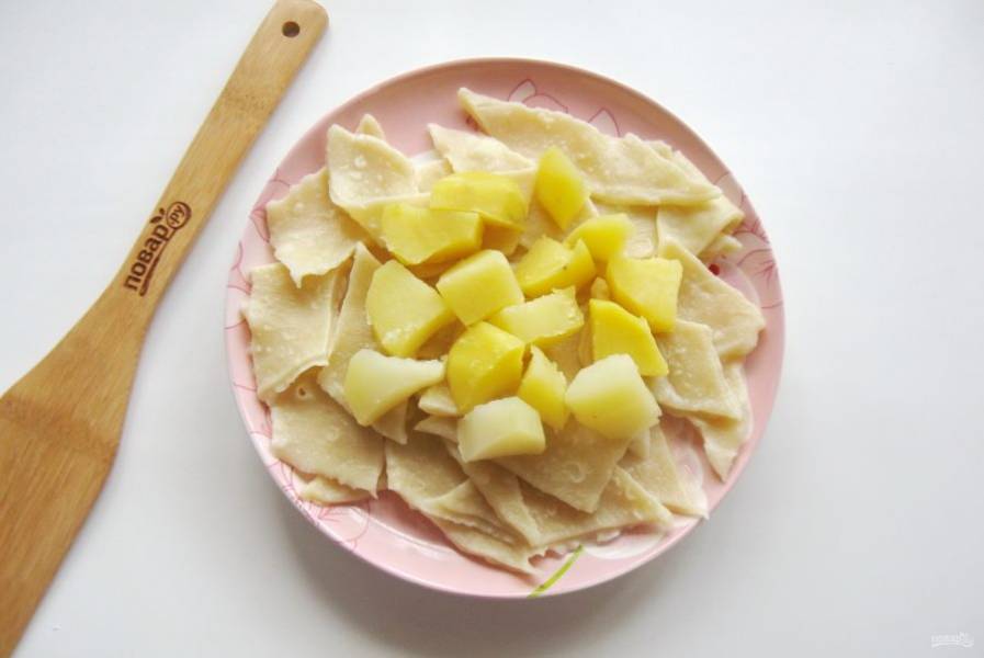 Выложите ромбы из теста на тарелку. Сверху разложите отварной картофель.