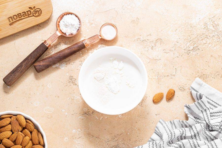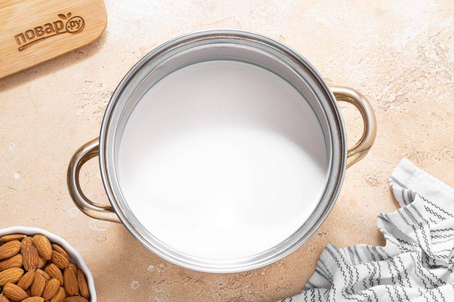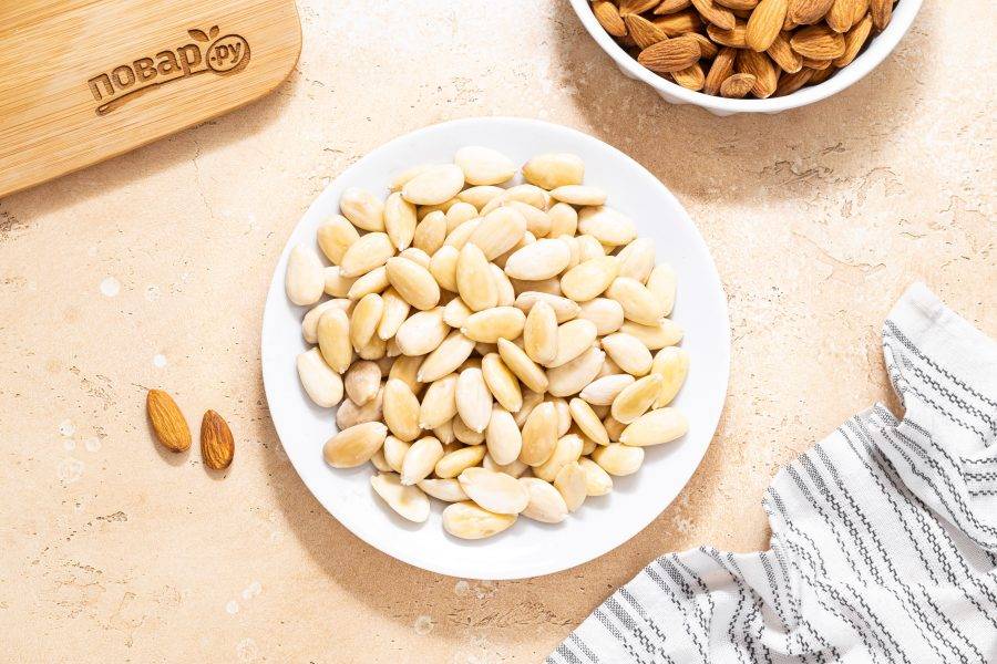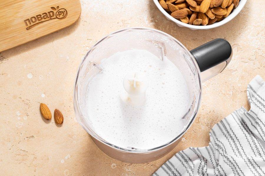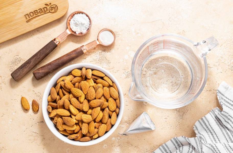 В начале нужно будет приготовить миндальное молоко. Миндаль замочите в воде на ночь. Если нет времени, можно замочить орехи в горячей воде на 1 час.