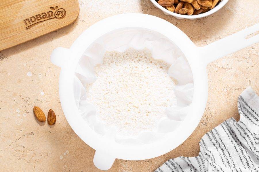 Получившуюся жидкость процедите через мелко сито или несколько слоев марли. Жмых очень тщательно отожмите. Теперь у вас есть домашнее миндальное молоко.