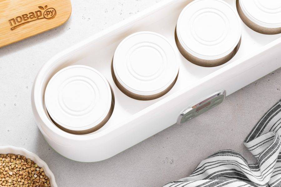 Поставьте баночки в йогуртницу на 8 часов при температуре 40 градусов. После уберите в холодильник еще на пару часов для стабилизации.