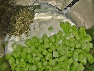 В большую чашку положить огурцы, соль, йогурт и сухую мяту.