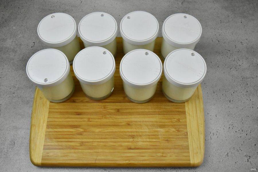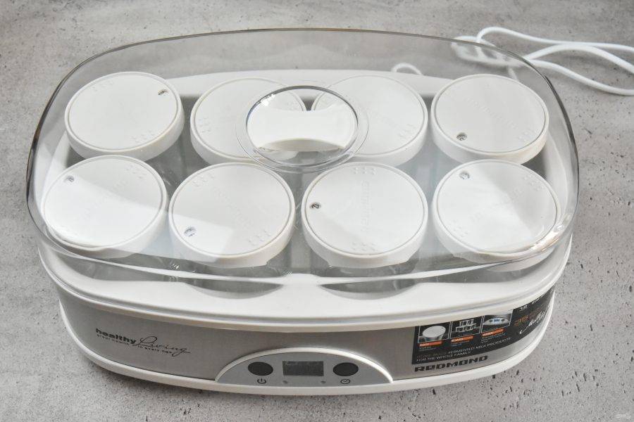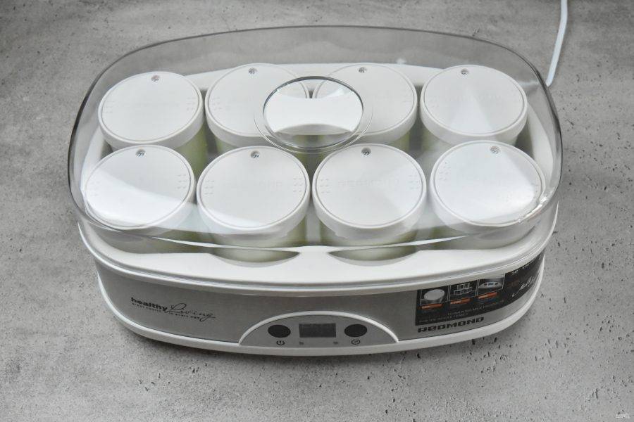 Установите стаканчики в йогуртницу. Накройте крышкой.