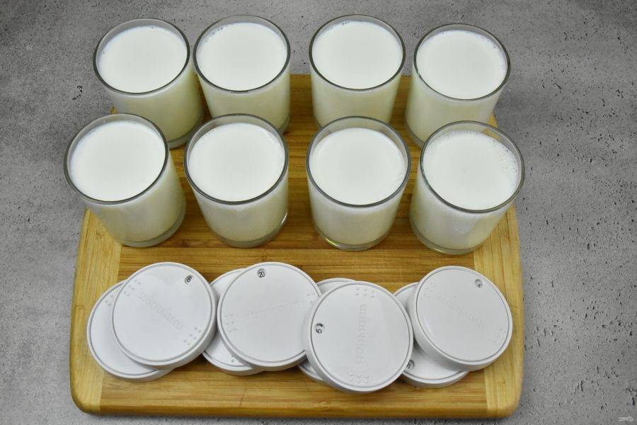 Аккуратно разлейте по стаканам молоко с закваской, стараясь его не вспенивать.