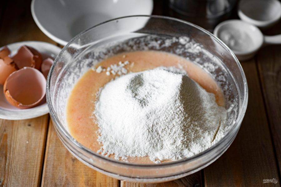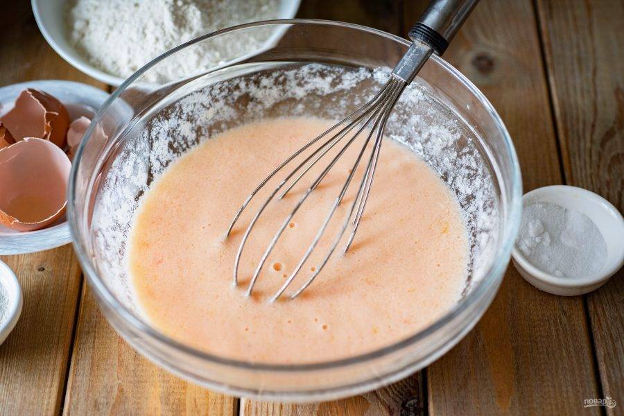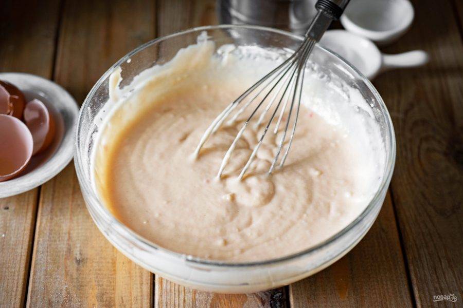 Все перемешайте венчиком, избавляясь от мучных комочков. Тесто получается однородное, похожее на оладьевое.