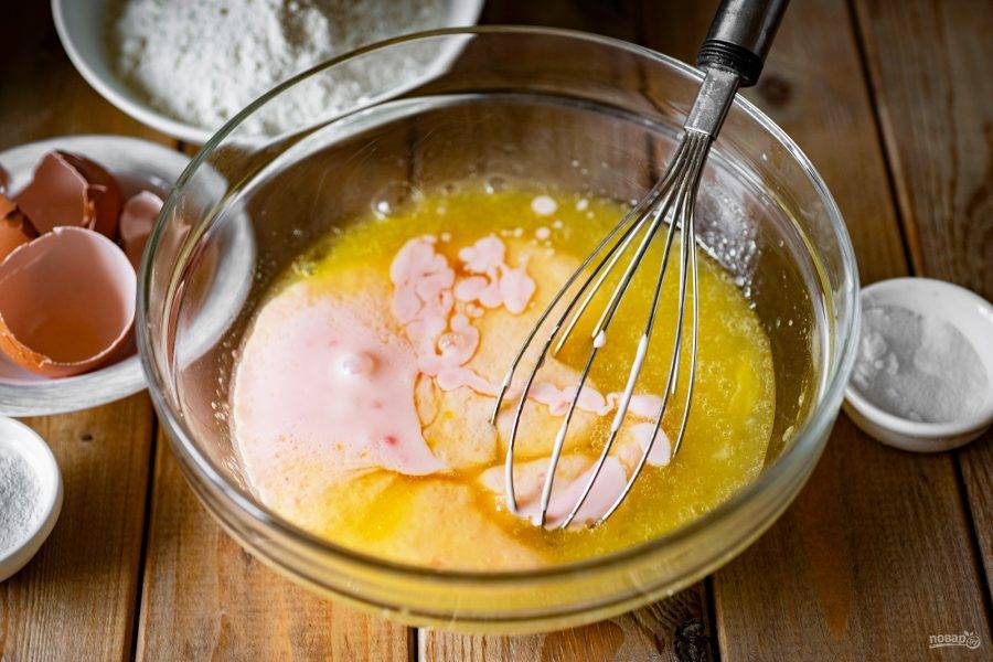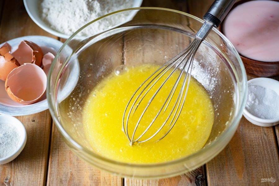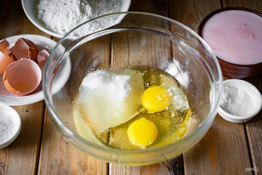 В миску вбейте яйца, добавьте растительное масло и сахар.