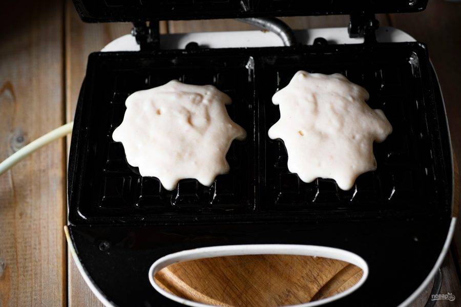 Панели электровафельницы смажьте тонким слоем растительного масла и выкладывайте на каждую панель по одной столовой ложке тесто. Выпекайте вафли до готовности — я пекла каждую по 2 минуты.