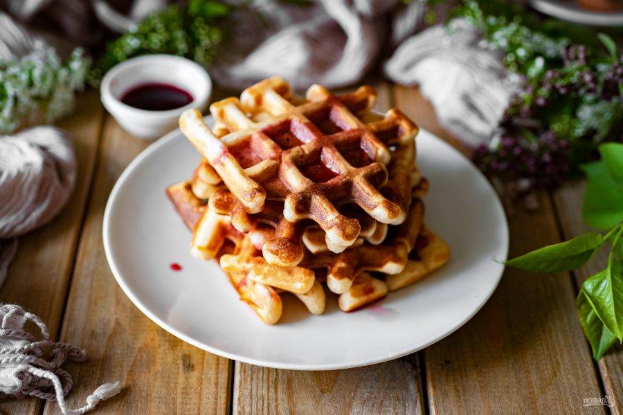 Готовые вафли полейте любимым сиропом и подавайте к столу.