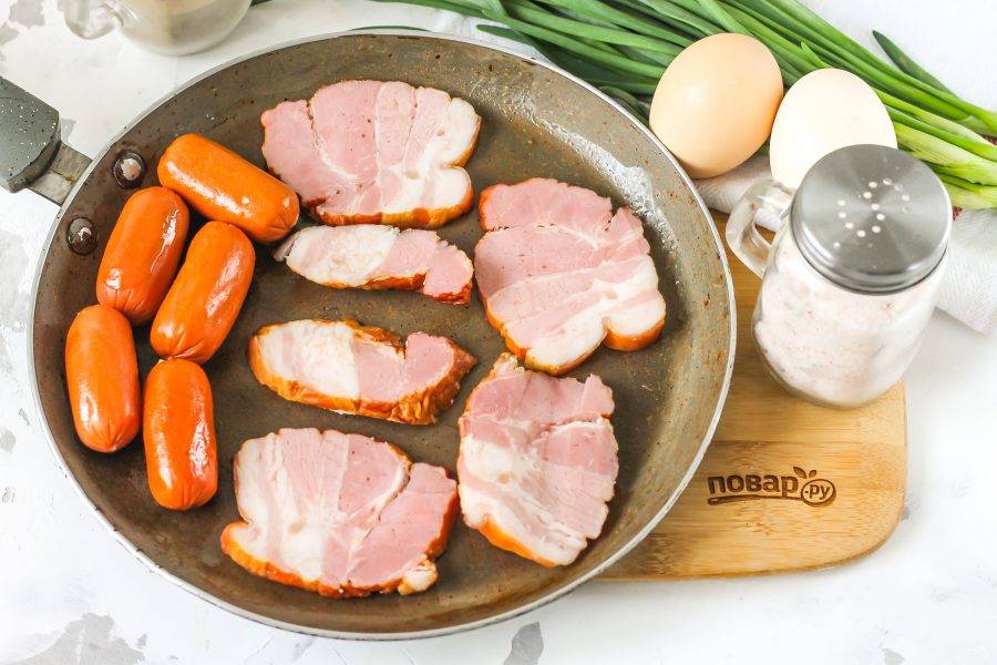 Прогрейте сковороду и обжарьте на ней сырой или копчено-соленый бекон, сосиски с обеих сторон. Снимите мясные изделия на тарелку, но сковороду не мойте!