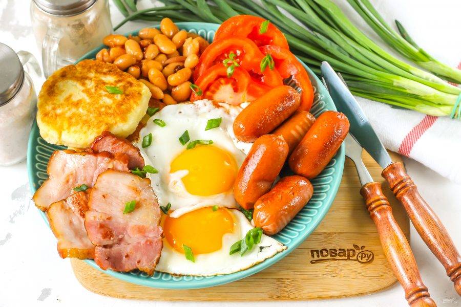 Ирландский завтрак — безумно калорийное и сытное северное блюдо, включающее в себя сборку отдельных ингредиентов: сосисок, бекона, яичницы, картофельного хлеба, фасоли в томате, помидоров и т.д.