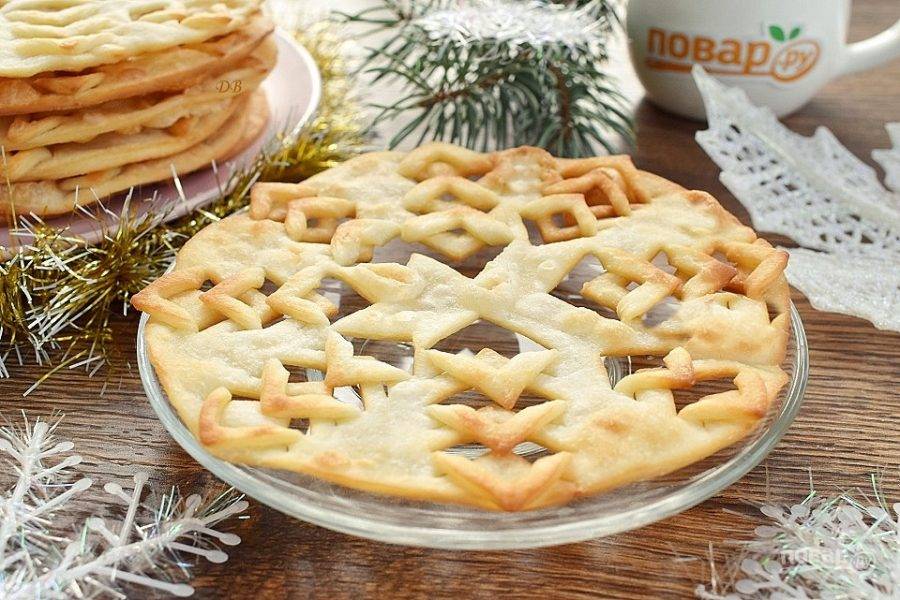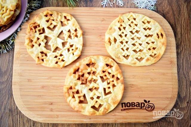 Лепешку сложите пополам, сделайте косые надрезы через равные промежутки вдоль сгиба. Разверните и согните лепешку в нескольких местах, сделайте надрезы. Подденьте кончиком ножа полученные уголки через один и поднимите их наверх, прижмите пальцем. Тесто наколите вилкой в нескольких местах. Складывайте заготовки между листами пергамента и накрывайте влажным полотенцем.