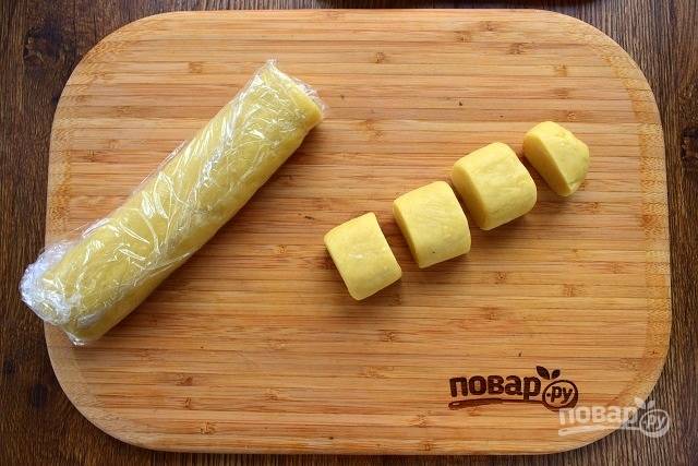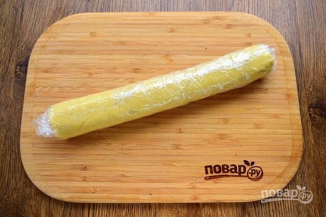 Вылейте смесь в мучную смесь, перемешайте деревянной ложкой. Немного остудите и руками замесите тесто. Вымешивайте тщательно, так, чтобы тесто стало гладким, но не тугим. Сформируйте толстую "колбаску", заверните ее в пищевую пленку, отложите на 1 час при комнатной температуре.