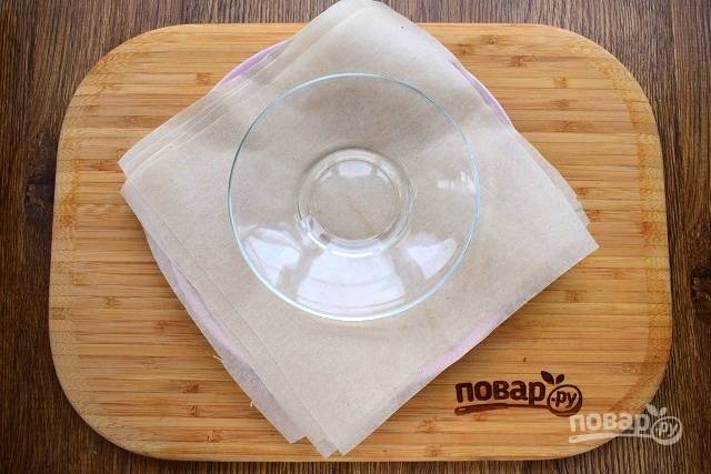 Тем временем подготовьте пергамент и блюдце диаметром 10-15 см. У меня — 13 см.