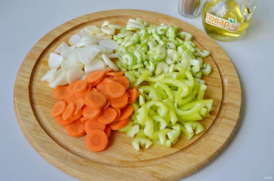 2. Порежьте вымытые овощи. В кастрюле с толстым (двойным) дном разогрейте масло и обжарьте овощи до мягкости.