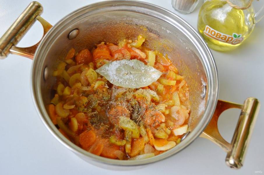 4. Добавьте помидоры к жареным овощам, а также тимьян, соль, сахар, лавровый лист, перец черный молотый и красный чили. Тушите 4-5 минут.