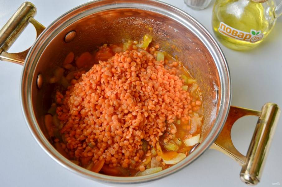 5. Промойте чечевицу, добавьте к овощам.