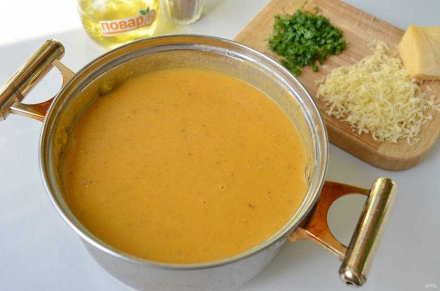 8. Доведите суп еще раз до кипения. Снимите с огня. Суп готов. Натрите сыр на мелкой терке, порежьте зелень.