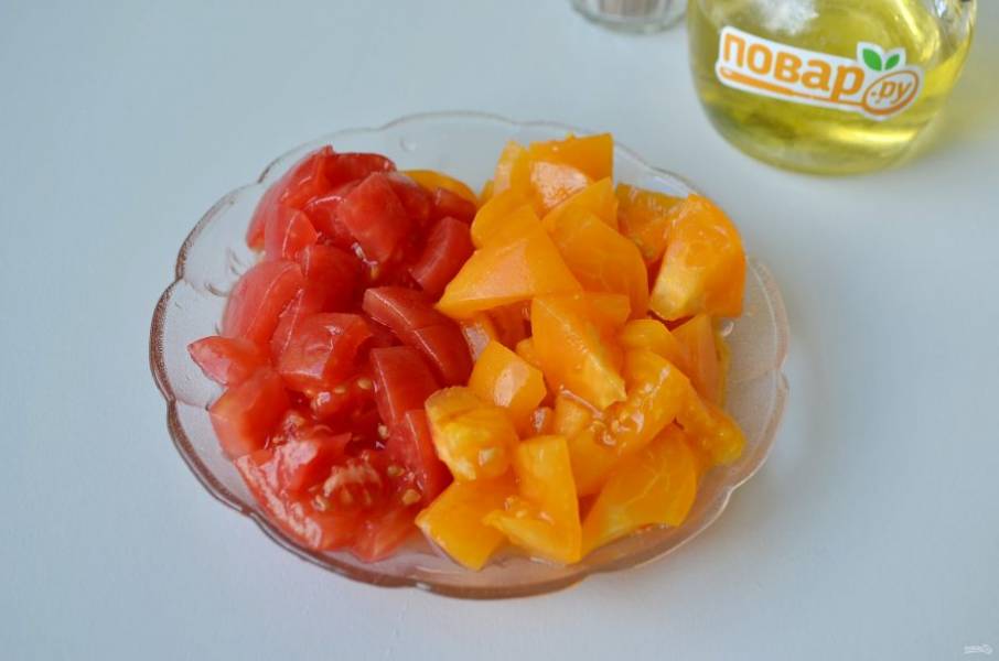 3. Помидоры обдайте кипятком, снимите кожицу и порежьте.