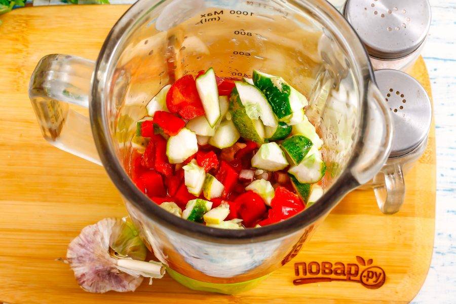 Влейте томатную массу в кувшин блендера, добавьте туда же пару очищенных зубчиков чеснока и все нарезанные овощи.
