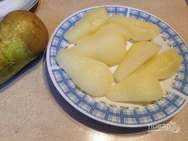 1. Нам понадобится 3 маленьких или 2 больших груши. Выбирайте не жесткие, но и не очень спелые плоды. Груши очистим от кожуры и сердцевины и разрежем на 4-6 частей.