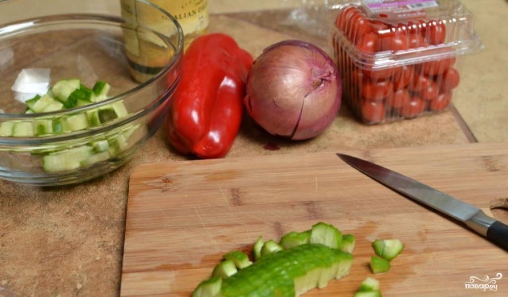 Подготовим все необходимые для итальянского салата ингредиенты. Овощи промываем и нарезаем мелкими кубиками и складываем в салатницу.