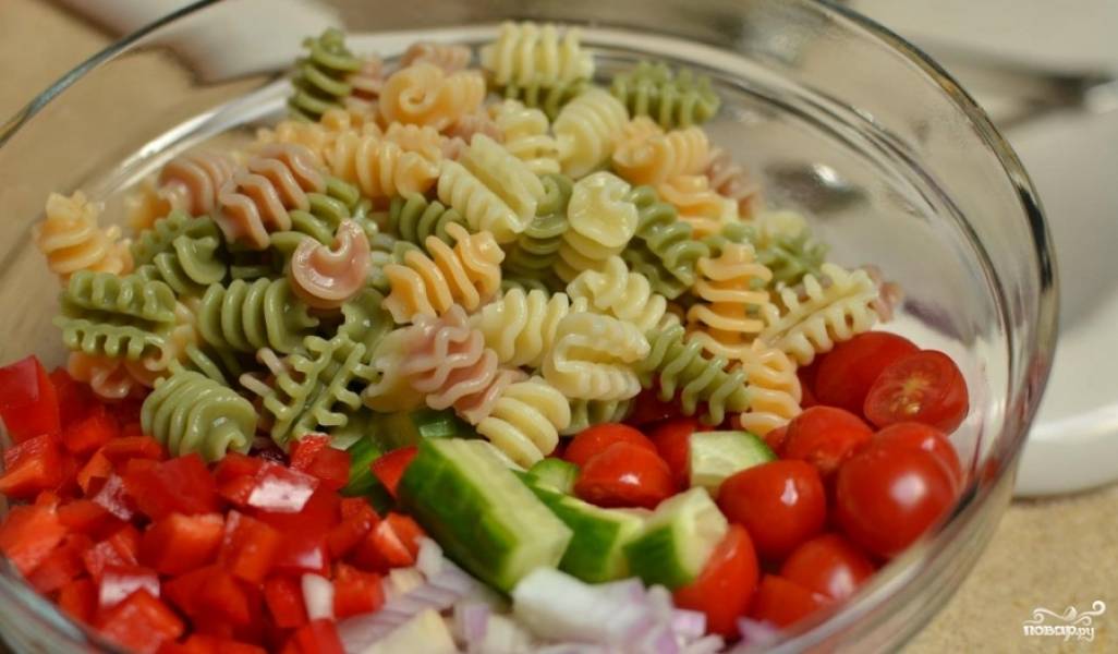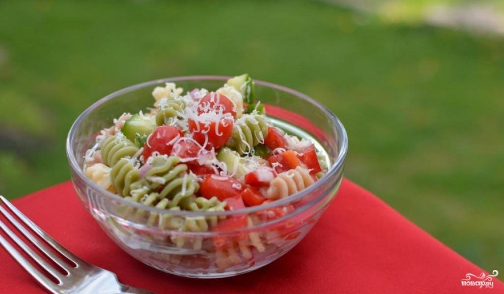 Рецепт приготовления салата с цветными макаронами, морковью, сельдереем, болгарским перцем, огурцом, помидорами, луком и сыром пармезан.