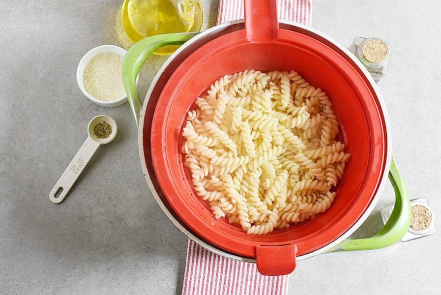 За это время сварите пасту до состояния аль-денте. Слейте, сохранив полстакана воды от макарон. Сохраняйте пасту горячей.
