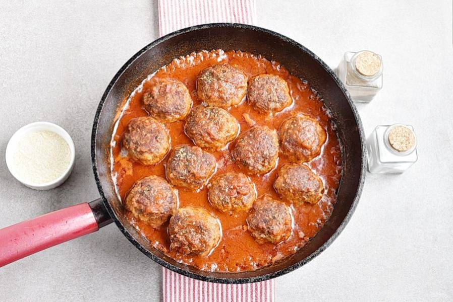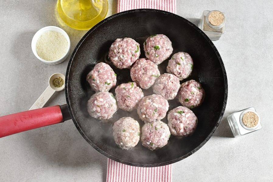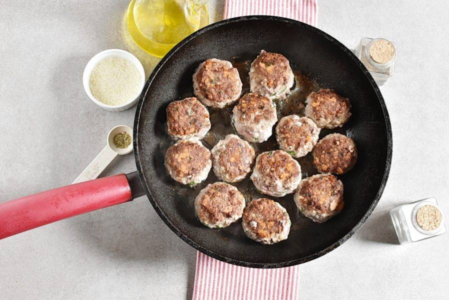 Разогрейте оливковое масло в глубокой сковороде. Выложите фрикадельки и обжарьте до румянца одну сторону.