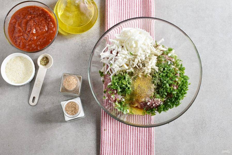Смешайте в глубокой миске фарш с хлебными крошками, тертой моцареллой, луком и петрушкой. Добавьте яйцо, посолите и поперчите по вкусу.