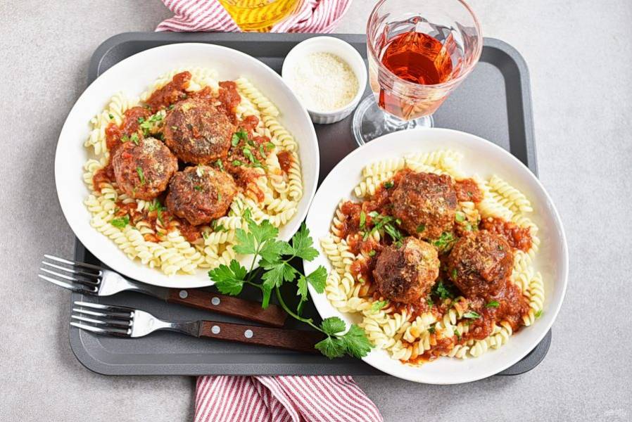 Выкладывайте пасту на подогретые тарелки, раскладывайте фрикадельки, щедро поливая их соусом.