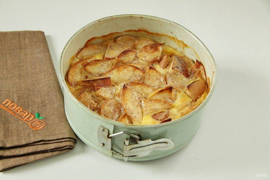 7. Нарежьте произвольно яблоки и разложите сверху. Смешайте оставшийся сахар и специи. Посыпьте равномерно яблоки.
