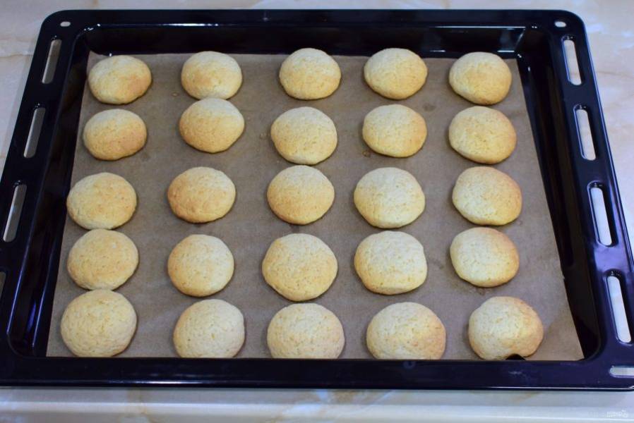 Затем застелите противень пергаментом. Мокрыми руками скатайте из теста небольшие шарики, немного их прижмите и выложите на противень. Поставьте печенье в духовку, предварительно разогретую до 180 градусов, примерно на 15-20 минут.