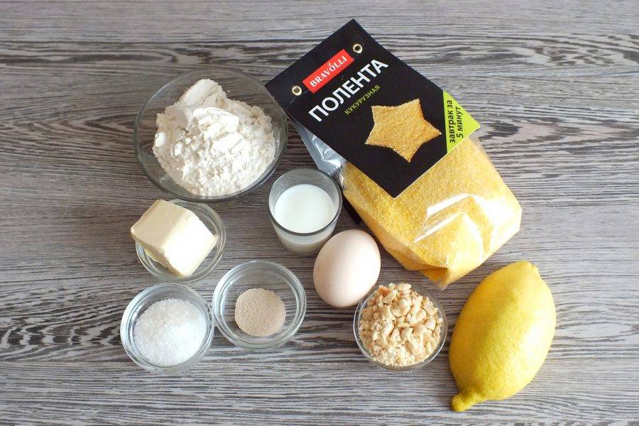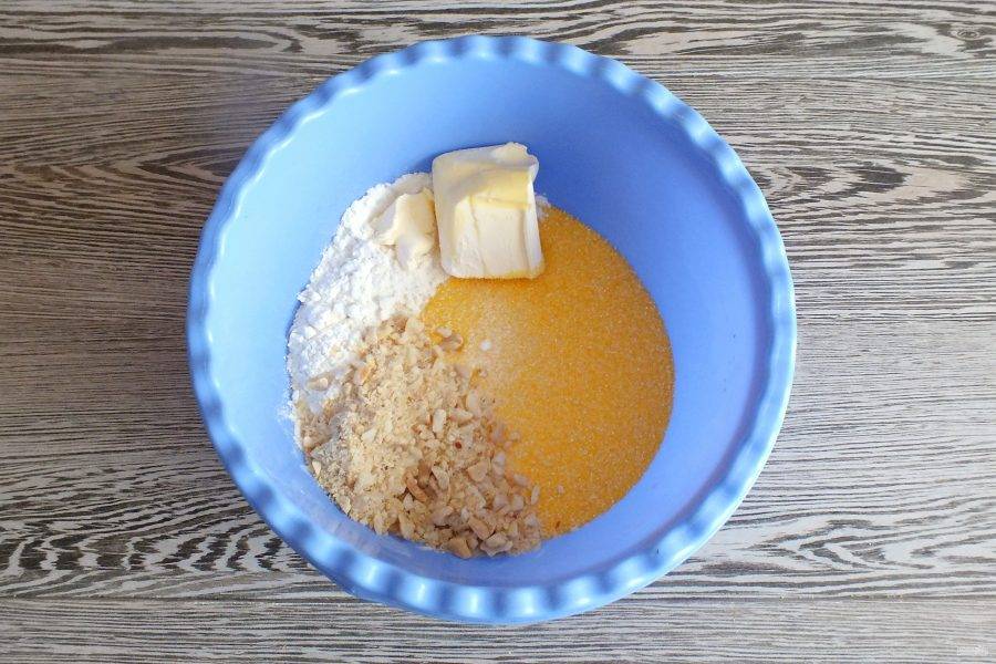 В чаше смешайте поленту "Bravolli", муку пшеничную, ванилин, дробленые орехи, мягкое сливочное масло, соль, цедру лимона. Перетрите руками в крупку.