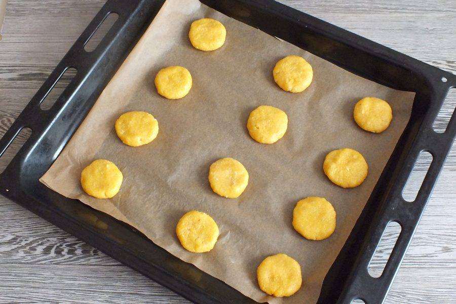 Каждый шарик прижмите ладонью до толщины 0,5 см. Выложите на противень, застеленный пекарской бумагой. Поставьте в разогретую до 170 градусов духовку на 10-12 минут.