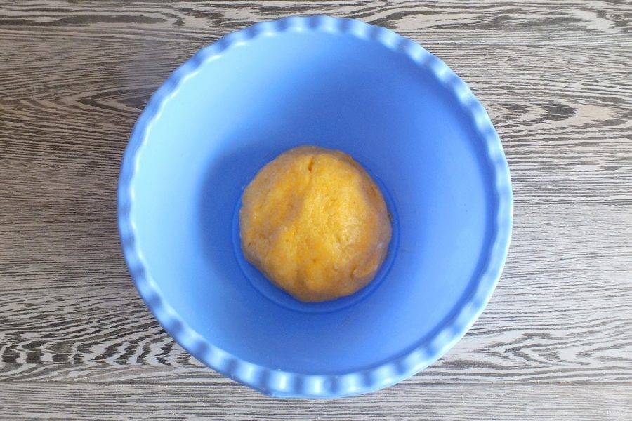 Готове тесто округлите, переложите в чашу и оставьте при комнатной температуре на 15 минут.