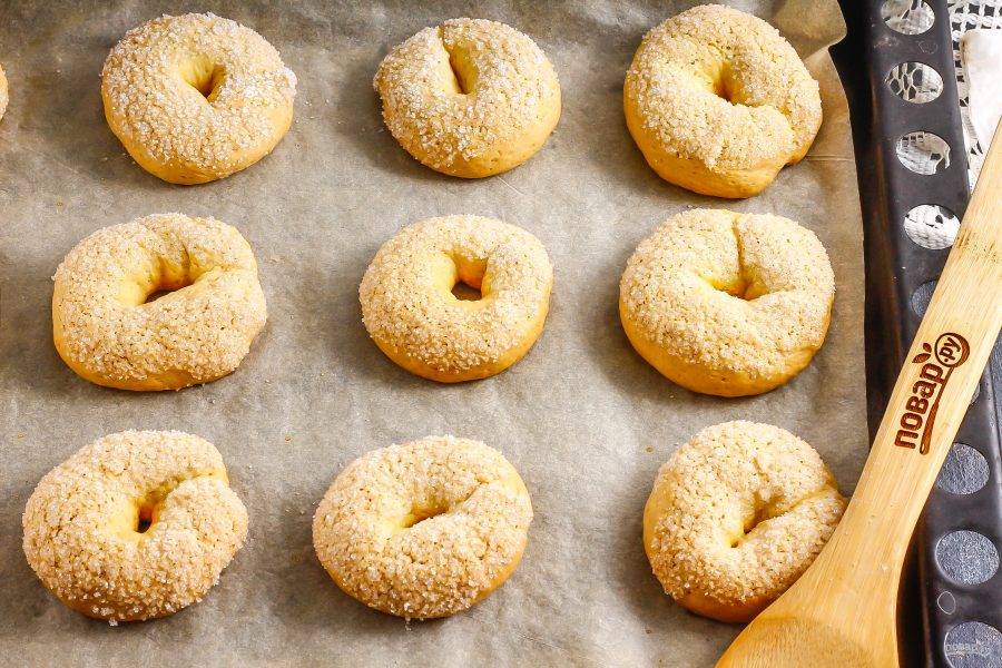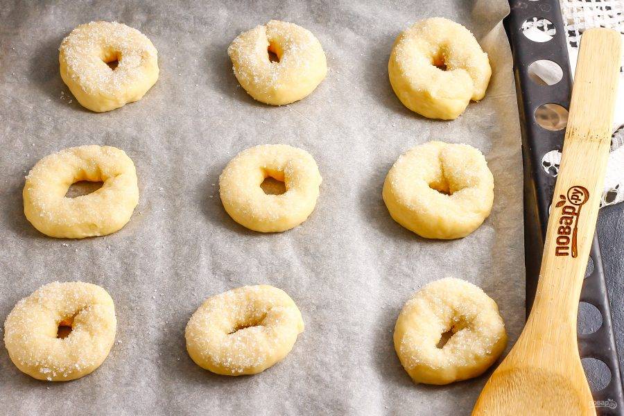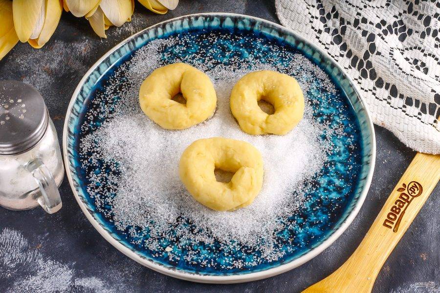 Немного сахара высыпьте на тарелку. Можно смешать сахар с молотой корицей или использовать коричневый. Подпылите рабочую поверхность мукой, разделите тесто на равные колобки и каждый из них раскатайте в небольшой жгут. Соедините концы жгутов, и обмакните колечки в сахар с одной стороны.
